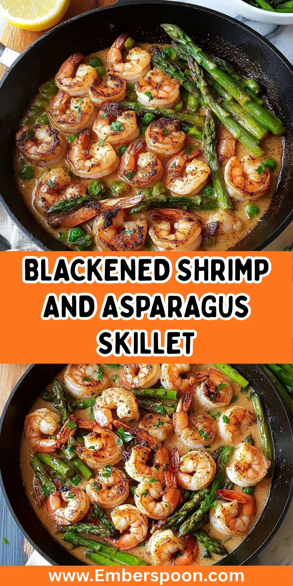 - This Blackened Shrimp and Asparagus Skillet is a breeze to prepare, taking just 20 minutes from start to finish.