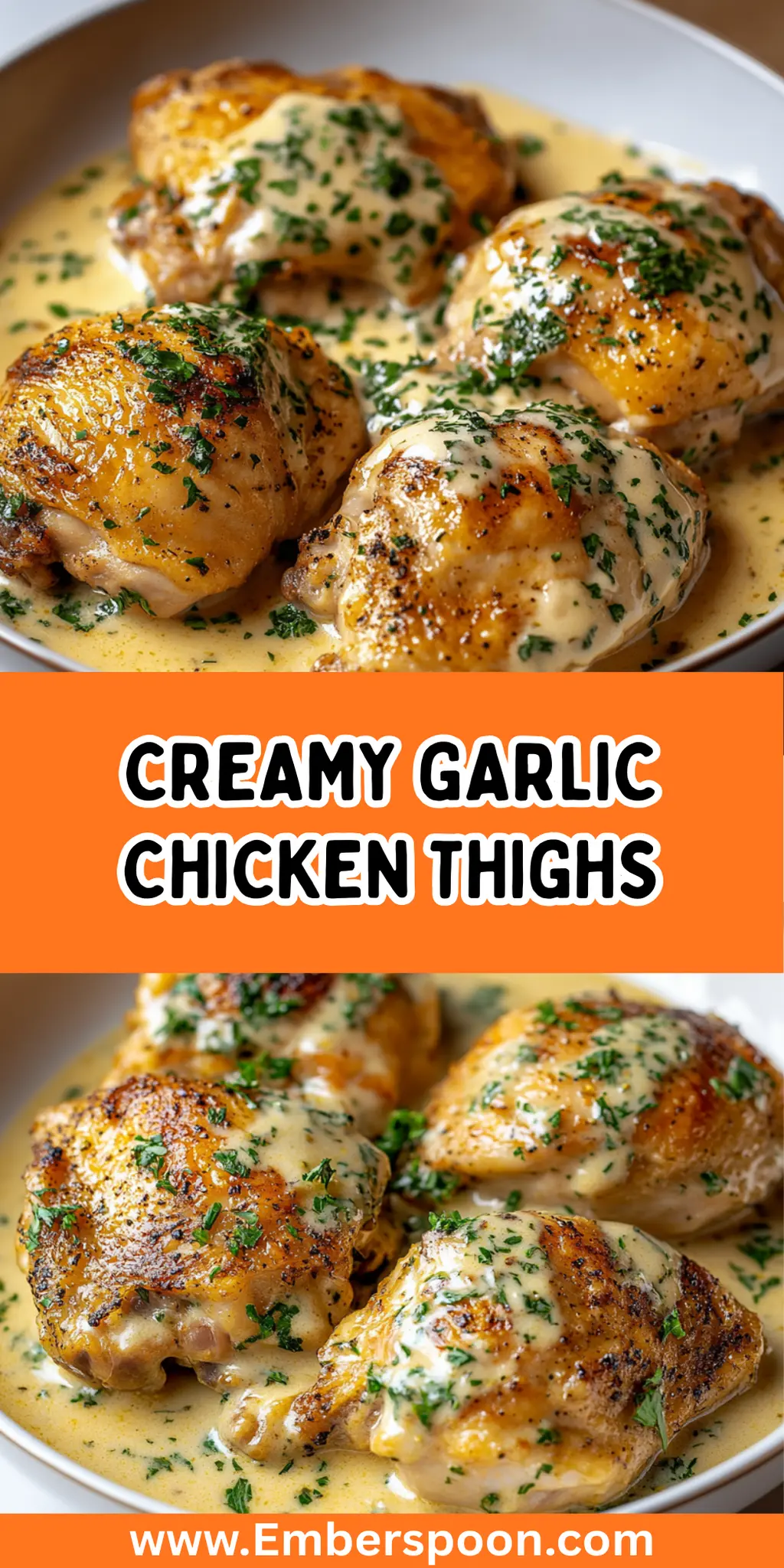 Serve and Garnish: Plate the chicken thighs generously draped in creamy garlic sauce. Don’t forget to garnish with fresh chopped parsley for that perfect finishing touch.