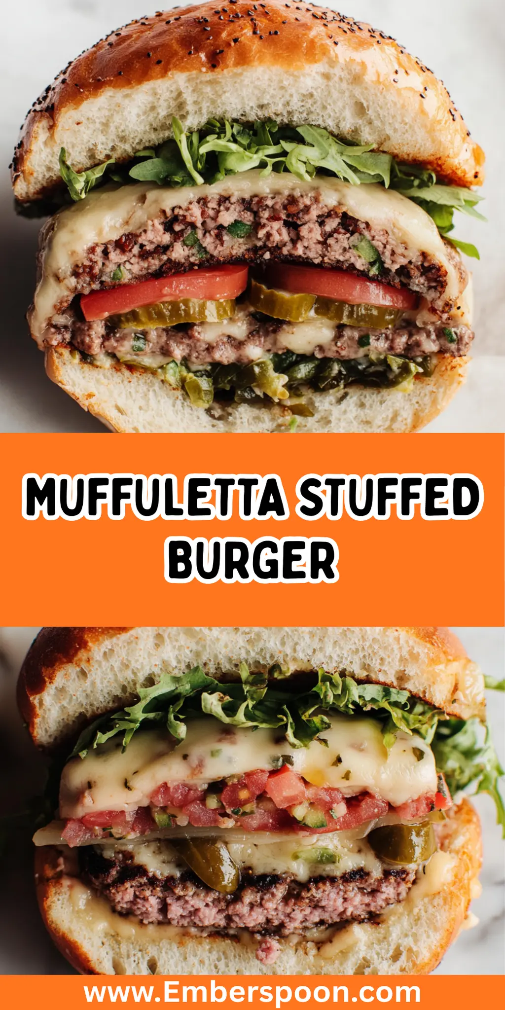 • Dive into the delightful elements of a Muffuletta Stuffed Burger!